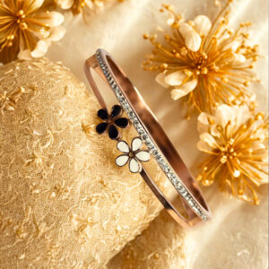 Rose Gold-Plated Floral American Diamond Kada Bracelet for Women | Black & White Enamel Flower Design Bangle