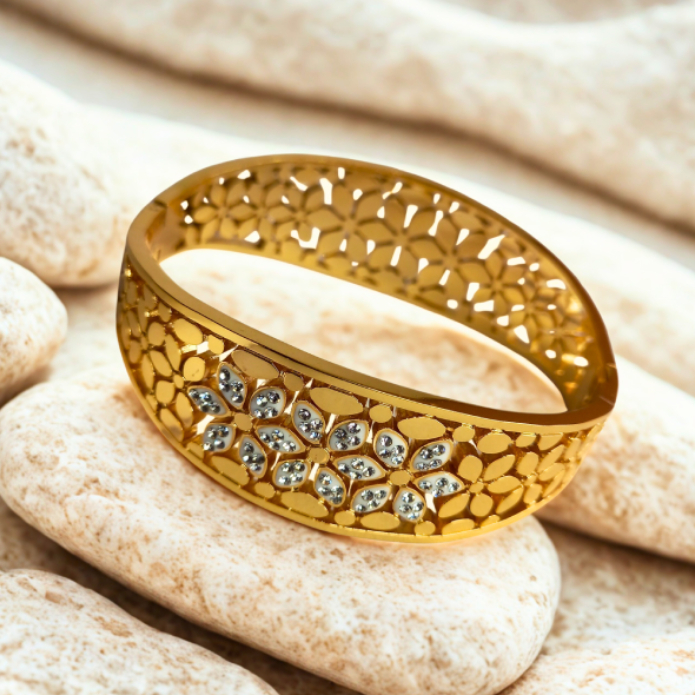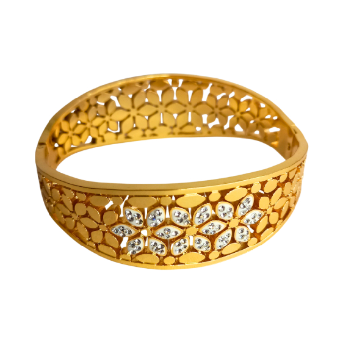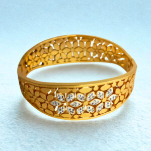 Add a touch of refined beauty to your jewelry collection with this intricately designed gold-plated bangle, featuring a mesmerizing floral cutwork pattern. The centerpiece is elegantly adorned with shimmering American diamonds, enhancing its traditional charm with a modern twist. Perfect for festive events, weddings, or as a statement accessory, this bangle is a timeless piece that elevates any ethnic or Indo-western look.