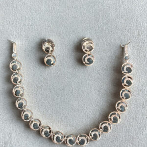 Grace your neckline with the sophisticated charm of this silver-toned necklace and earring set from Jeyaar Fashion. This delicately crafted ensemble showcases sleek circular motifs, each studded with radiant American Diamonds that shimmer with every move. The matching double-drop earrings perfectly complement the necklace, making it a timeless addition to your jewellery collection for festive, bridal, or formal occasions.