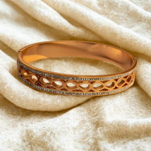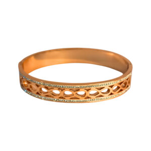 Make a timeless style statement with this elegant rose gold bangle featuring a distinctive openwork cutout design. Lined with delicate crystal accents along the top and bottom edges, this bracelet adds just the right touch of sparkle. Whether paired with ethnic attire or modern outfits, this versatile piece brings sophistication and grace to any occasion.