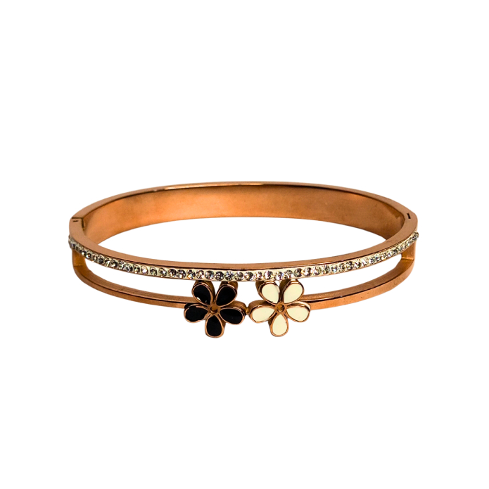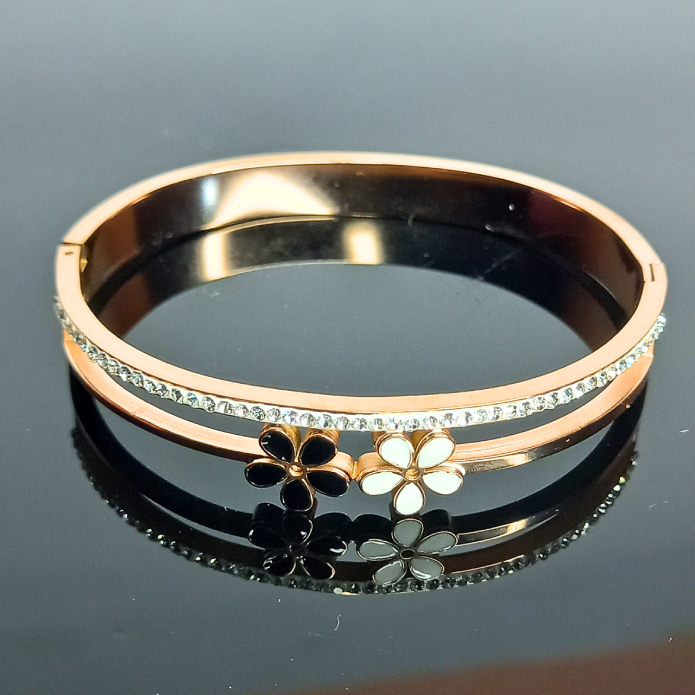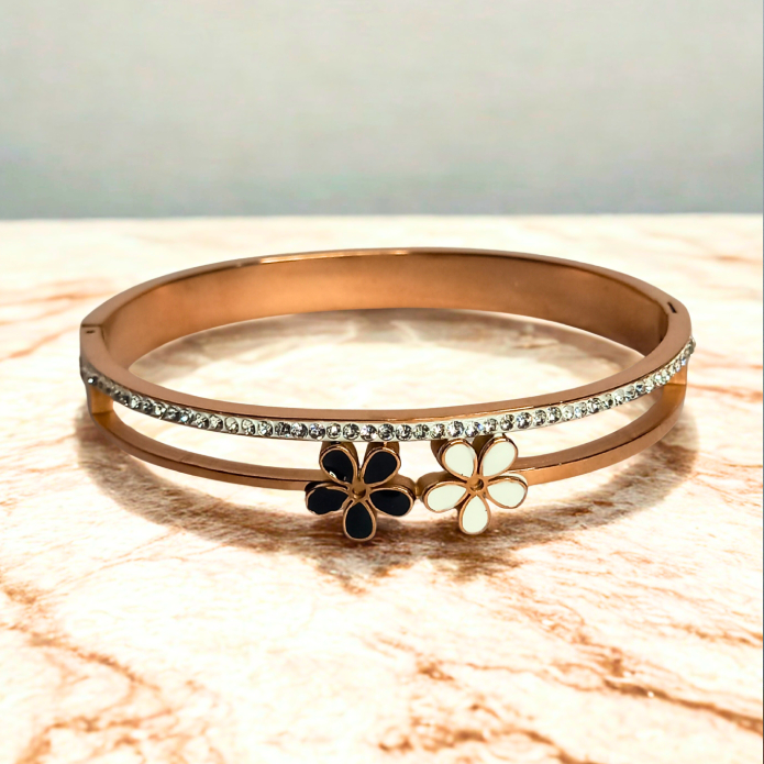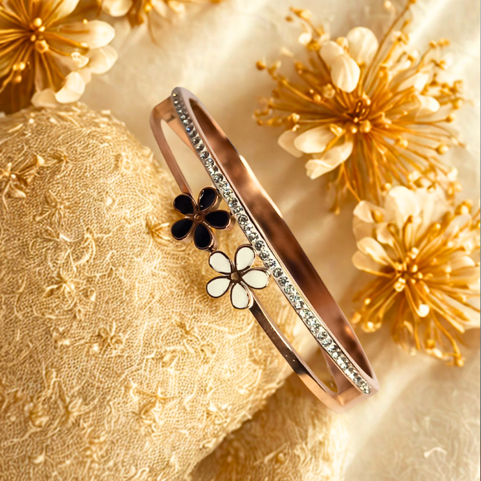 Designed to make a statement, this elegant bangle features two adorable enamel flower motifs—one in black and one in white—set against a sleek rose gold band. A row of sparkling American diamonds enhances its luxe appeal, making it perfect for party wear, casual outings, or festive occasions.