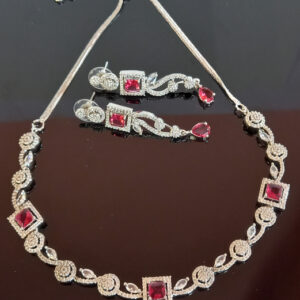 Make a bold and beautiful statement with the Jeyaar Silver-Toned Ruby Red Necklace & Earring Set. This exquisite piece features deep ruby-hued square and teardrop stones, surrounded by brilliant American Diamonds. The necklace’s alternating floral and oval motifs offer a regal aesthetic, while the intricately crafted long earrings add a graceful finishing touch — ideal for weddings, receptions, and festive occasions.
